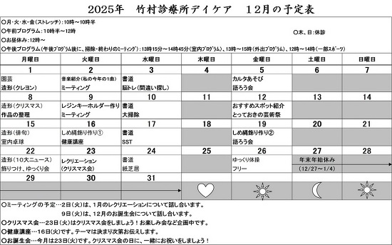 デイケアでは、プログラムに沿って活動しています。プログラムは、曜日によって異なりますので、デイケア月間予定表をご確認ください。
