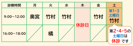 *診療所休診予定日がある場合には、その日の奥宮医師、橘医師、西嶋医師の診療も休診となります