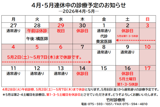 *令和8年4月末~5月初めごろの診療予定は以下の通りです。