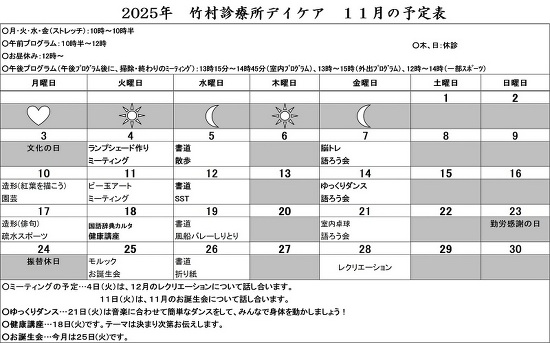 デイケアでは、プログラムに沿って活動しています。プログラムは、曜日によって異なりますので、デイケア月間予定表をご確認ください。