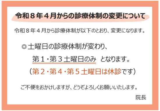 ・土曜日は診療体制の都合あり、予約されている方のみの診療とさせていただきます。